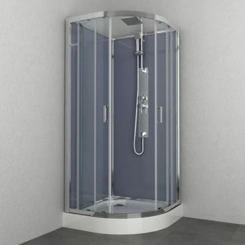 Met de Allibert douchecabine Everest 90x90cm kwartrond haal je een zeer complete set in huis; de douchecabine wordt geleverd met een hoofddouche, een 3-standen handdouche met doucheslang (150 cm) en een mengkraan. De douchecel heeft een afmeting van 90 cm breed, 90 cm diep en 225 cm hoog. De voorzijde is afgerond en is voorzien van twee schuifdeuren (hoekinstap) met een glasdikte van 5 mm veiligheidsglas, de zijwanden en achterwand zijn 4 mm dik. Het veiligheidsglas heeft een speciale coating die beschermt tegen het vormen van aanslag van kalk en zeepresten. Zo houd je het glas gemakkelijk schoon. De douchebak heeft een afmeting van 90×90 cm en een diepte van 14 cm, met een afvoer met een diameter van 90 mm.