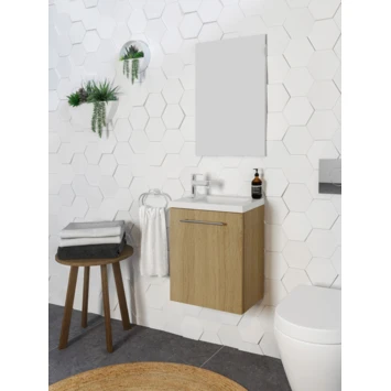 Maak het jezelf makkelijk met de Belem Pack van Allibert. Het kastje onder de wastafel krijg je voorgemonteerd geleverd; je hoeft het wandmeubel alleen nog aan de muur te hangen met schroeven. Het heeft de afmetingen van 40 cm breed, 48 cm hoog en 25 cm diep. De kast heeft een naar rechtsdraaiend deurtje (met scharnieren aan de rechterzijde) en met het soft-close systeem sluit je deze altijd zachtjes. De eiken kleur afwerking heeft een mooie natuurlijke uitstraling. Met de horizontale smalle greep oogt deze kast bovendien rustig. Het meubel past perfect in jouw botanische of moderne badkamer.