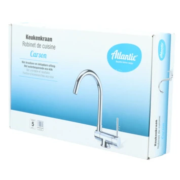 De Atlantic keukenkraan Carson met hendel Chroom bestaat uit een glanzende keukenkraan van 30 cm hoog met 2 flexibele aansluitslangen, bevestigingsmateriaal en montagehandleiding. De Carson keukenkraan heeft een draaibare uitloop van 360° waarmee je eenvoudig plaats maakt bij je gootsteen. Ook kun je de uitloop tot 90° naar beneden inklappen, wat heel handig is als je bijvoorbeeld het raam achter de kraan open wil zetten. Met de eenhendelbediening draai je met 1 hand de kraan naar de gewenste temperatuur. Je bespaart water door de ingebouwde eco-klik. Een ingebouwde weerstand in de hendel zorgt ervoor dat je de kraan niet direct op de hoogste straalstand zet. Wens je toch een hardere straal, dan zet je de hendel verder open. Aan de anti-kalk perlator hecht kalk zich moeilijk vast en veeg je er met de hand af. Deze keukenkraan heeft een mooie glanzende chromen afwerking. Gebruik alleen water en een zachte doek om de kraan schoon te maken. Gebruik geen schurend, bijtend, azijnhoudend of agressief schoonmaakmiddel. Op de kraan heb je 5 jaar garantie.