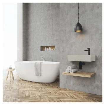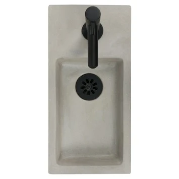 Fonteinset Jukon beton past met zijn betonlook en zwarte kraan perfect een trendy toilet. De sifon is net als de kraan zwart afgewerkt, waardoor een mooi geheel ontstaat. De kraan en de sifon zijn meegeleverd. De fontein zelf is gemaakt van beton en 38,5×18,5x9cm groot.