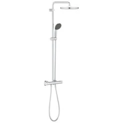 Stap onder een douche waar je meer bewegingsruimte hebt, met verschillende aangename straalsoorten en met alle gemaksvoordelen die een thermostaat biedt. Dit opbouwsysteem om aan de wand te monteren bestaat uit een Vitalio Start 250 hoofddouche, een Vitalio Start 100 handdouche, thermostaat, douchestang met 390mm zwenkbare douchearm en glij-element om de handdouche te verstellen, plus een 1750mm VitalioFlex Comfort Twistfree doucheslang. De hoofddouche van 250mm biedt een zachte, ontspannende Rain Spray. De 100mm handdouche wordt geleverd met een ShockProof siliconen ring om hem te beschermen tegen vallen of stoten. Het heeft 2 straalsoorten; de zachte Rain Spray en de krachtige, gerichte Jet Spray. Beide douches zijn voorzien van waterbesparende GROHE EcoJoy – de stroming wordt beperkt tot 9,5 l/min bij de hoofddouche en 5,7 l/min bij de handdouche – waardoor je minder water verbruikt maar wel geniet van dezelfde geweldige prestaties. GROHE DreamSpray zorgt ervoor dat de stroom uit elk sproeigaatje precies goed is waardoor je douche-ervaring nog meer comfort en plezier biedt. De SpeedClean-sproeigaatjes zijn ontworpen om de kalkaanslag met je vinger vanaf te vegen. Het douchesysteem levert water met een constante temperatuur zodat je nooit voor onaangename verrassingen komt te staan dankzij GROHE’s TurboStat-technologie. Om je te beschermen tegen verbranding is de GROHE SafeStop-knop ingesteld op 38°C om te voorkomen dat met name kinderen de watertemperatuur per ongeluk te hoog zetten. En de GROHE SafeStop Plus-temperatuurbegrenzer kan worden ingesteld op 43°C voor extra veiligheid. Schakel tussen hoofd- en handdouche en regel het volume, allemaal via één handgreep dankzij de AquaDimmer-functie. De duurzame maar oogverblindende GROHE StarLight chroom afwerking zorgt ervoor dat het douchesysteem er jarenlang onberispelijk uit blijft zien.