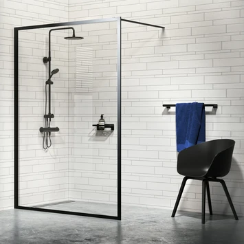 De inloopdouche A3 Contour Zwart 118x200cm heeft een minimalistisch kader wat afgewerkt is in matzwart. De douchewand heeft 6mm dik veiligheidsglas en is voorzien van een antikalk laag. Dankzij deze laag blijft het glas nog langer mooi helder. De inloopdouche wordt geplaatst met een stabilisatiesteun van 1 meter. De steun is tot de gewenste lengte in te korten en ook in een hoek te monteren. Hierdoor past de Inloopdouche A3 Contour Zwart 118x200cm in bijna iedere badkamer.